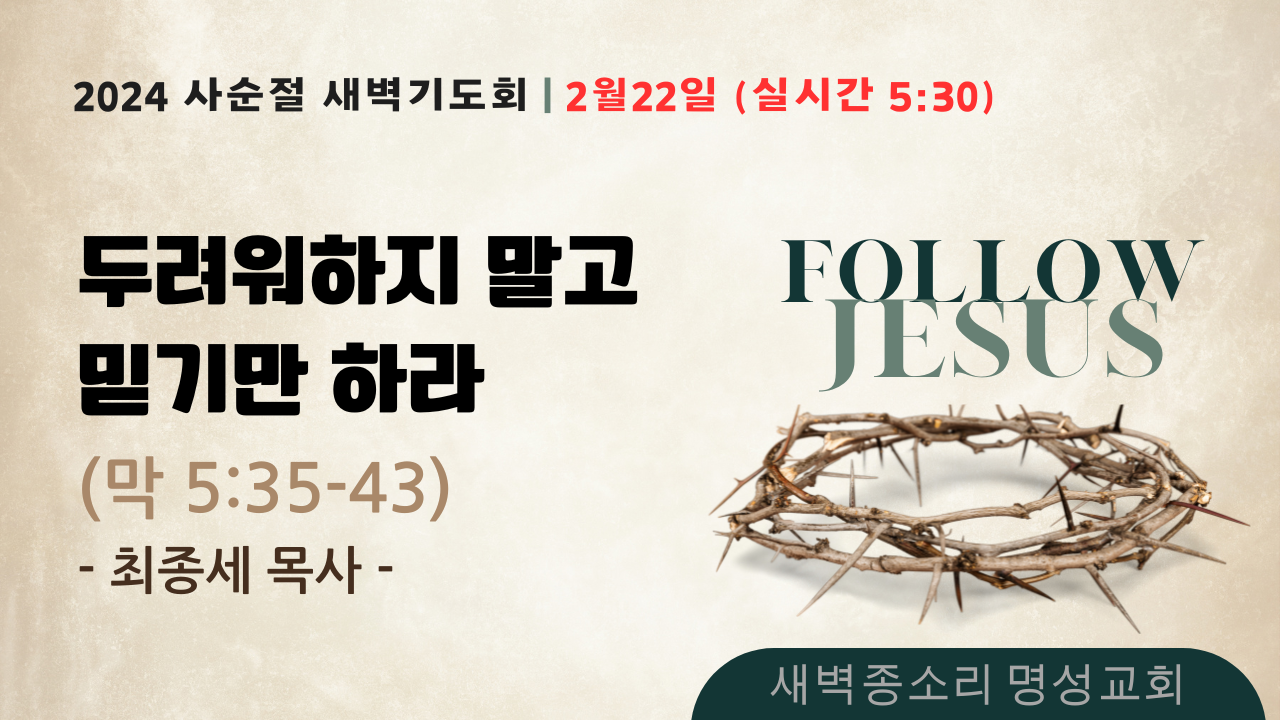 2024-02-22 사순절 특별새벽기도회 (실시간: 5:30) | 두려워 말고 믿기만 하 | 막5:35-43 | 최종세 목사 |새벽종소리 명성교회
