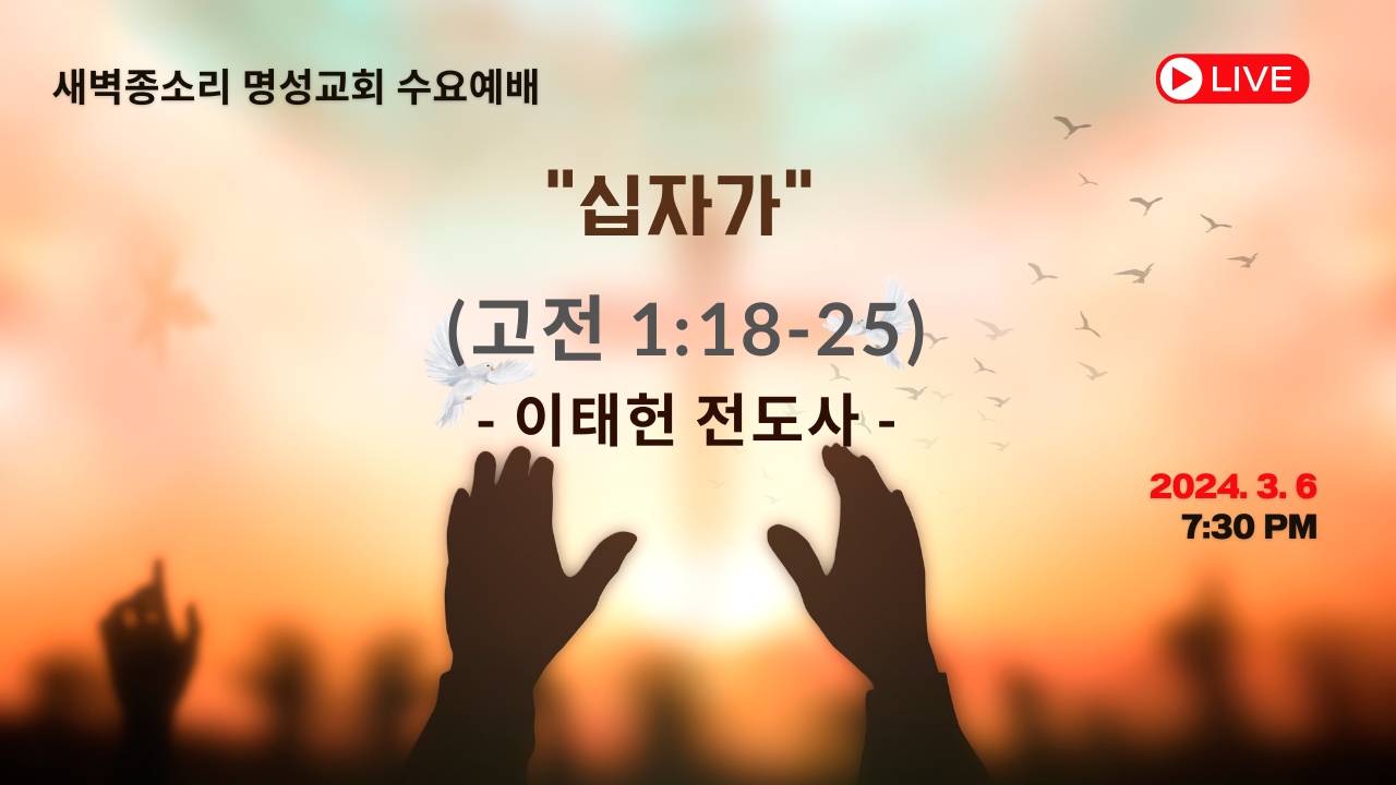 2024-03-06 수요기도회 (실시간: 7:30) | 십자가 | 성경: 고전 1:18-25 | 설교: 이태헌 전도사 | 새벽종소리 명성교회