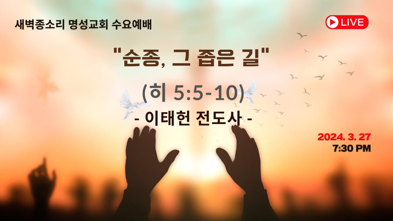 2024-03-20 수요기도회 (실시간: 7:30) | 순종, 그 좁은 길 | 성경: 히 5:5-10 | 설교: 이태헌 전도사 | 새벽종소리 명성교회